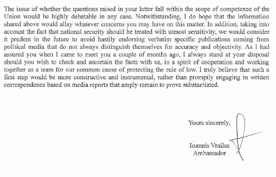 Ωστόσο, φαίνεται πως ο κ. Οικονόμου επιβεβαιώνει εντέλει το δημοσίευμα του Politico και της Ν. Σταμούλη, με τα ίδια τα λεγόμενά του. Το επίμαχο δημοσίευμα άλλωστε ανέφερε πως στην ανταλλαγή επιστολών μεταξύ Ευρωπαϊκής Επιτροπής και ελληνικής κυβέρνησης στις αρχές Αυγούστου, λίγο πριν τις παραιτήσεις δηλαδή των Δημητριάδη και Κοντολέοντα, στις 2 Αυγούστου η Κομισιόν δεχόταν επιστολή από τον μόνιμο αντιπρόσωπο της Ελλάδας στην Ε.Ε. η οποία ανέφερε: “Λαμβάνοντας υπόψη το γεγονός ότι η εθνική ασφάλεια θα πρέπει να αντιμετωπίζεται με τη μεγαλύτερη ευαισθησία, θα θεωρούσαμε συνετό στο μέλλον να αποφεύγετε να ενστερνίζεστε βιαστικά συγκεκριμένες δημοσιεύσεις που έρχονται από πολιτικά Μέσα τα οποία δεν χαρακτηρίζονται πάντα για την ακρίβεια και την αντικειμενικότητά τους“.