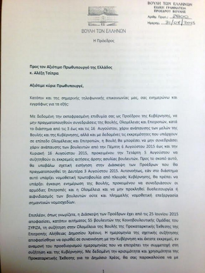 Με την επιστολή – η οποία στάλθηκε την 31η Ιουλίου 2015 και για την οποία ενημερώθηκε σήμερα η Διάσκεψη των προέδρων – η κυρία Κωνσταντοπούλου ζητά από τον πρωθυπουργό να την ενημερώσει για τις ημερομηνίες στις οποίες θα ήταν δυνατή για την κυβέρνηση η πραγματοποίηση της συζήτησης στην Ολομέλεια της Βουλής σχετικά με την Προκαταρκτική Έκθεση της Επιτροπής Αλήθειας Χρέους (όπως είχε αποφασίσει η Διάσκεψη των προέδρων από τις 25 Ιουνίου 2015).