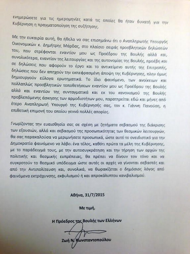 Στην επιστολή, η πρόεδρος της Βουλής αναφέρει: «Με την ευκαιρία αυτή, θα ήθελα να σας επισημάνω ότι ο αναπληρωτής υπουργός Οικονομικών Δημήτρης Μάρδας, στο πλαίσιο σειράς προσβλητικών δηλώσεών του, που στρέφονται εναντίον μου ως προέδρου της Βουλής αλλά και, συνολικότερα, εναντίον της λειτουργίας και της αυτονομίας της Βουλής, προέβη και σε δηλώσεις που αφορούν το έργο και το αντικείμενο αυτής της Επιτροπής, δηλώσεις που δεν απηχούν την εκπεφρασμένη άποψη της κυβέρνησης, πλην όμως δημιουργούν εύλογα ερωτηματικά. Το ίδιο φαινόμενο, των ανοίκειων και πολλαπλώς προσβλητικών τοποθετήσεων εναντίον μου ως προέδρου της Βουλής αλλά και εναντίον της συνταγματικά και εκ του κανονισμού της Βουλής προβλεπόμενης άσκησης των αρμοδιοτήτων μου, παρατηρείται εδώ και μήνες από έτερο αναπληρωτή υπουργό της κυβέρνησής σας, τον κ. Γιάννη Πανούση, η επιθετική επιμονή του οποίου γεννά πολλές απορίες».