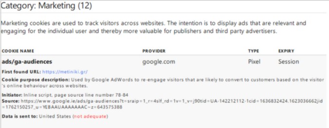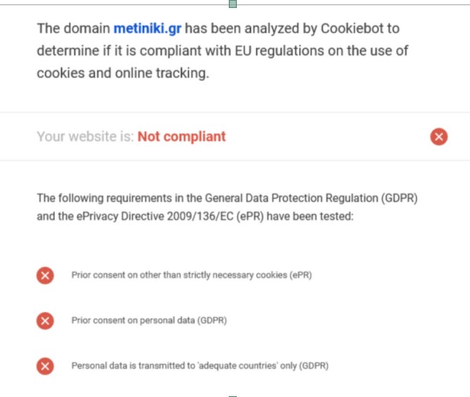 Τι παρατηρούμε εδώ; Ότι το metiniki.gr δε ζητά συγκατάθεση για να εγκαταστήσει cookies πέραν των αναγκαίων, συλλέγει προσωπικά δεδομένα χωρίς τη συγκατάθεση των χρηστών, διαβιβάζει δεδομένα σε χώρες που δε θεωρούνται ασφαλείς από την Ευρωπαική Ένωση βάσει GDPR.