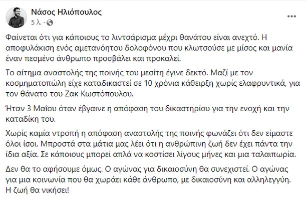 H αποφυλάκιση του μεσίτη που είχε καταδικαστεί για το θάνατο του Ζακ Κωστόπουλου προκάλεσε την αντίδραση του Νάσου Ηλιόπουλου ο οποίος έκανε σχετικό ποστάρισμα στο facebook.