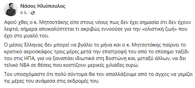 «Αφού χθες ο κ. Μητσοτάκης είπε στους νέους πως δεν έχει σημασία ότι δεν έχουν λεφτά, σήμερα αποκαλύπτεται τι ακριβώς εννοούσε για την “ολιστική ζωή” που έχει στο μυαλό του. Ο μέσος Έλληνας δεν μπορεί να βγάλει τον μήνα και ο κ. Μητσοτάκης παίρνει το κρατικό αεροσκάφος τρεις μέρες μετά την επιστροφή του από το επίσημο ταξίδι του στις ΗΠΑ, για να ξαναπάει ιδιωτικά στη Βοστώνη και, μεταξύ άλλων, να δει τελικό NBA σε θέσεις που κοστίζουν μερικές χιλιάδες ευρώ» έγραψε χαρακτηριστικά ο κ. Ηλιόπουλος.