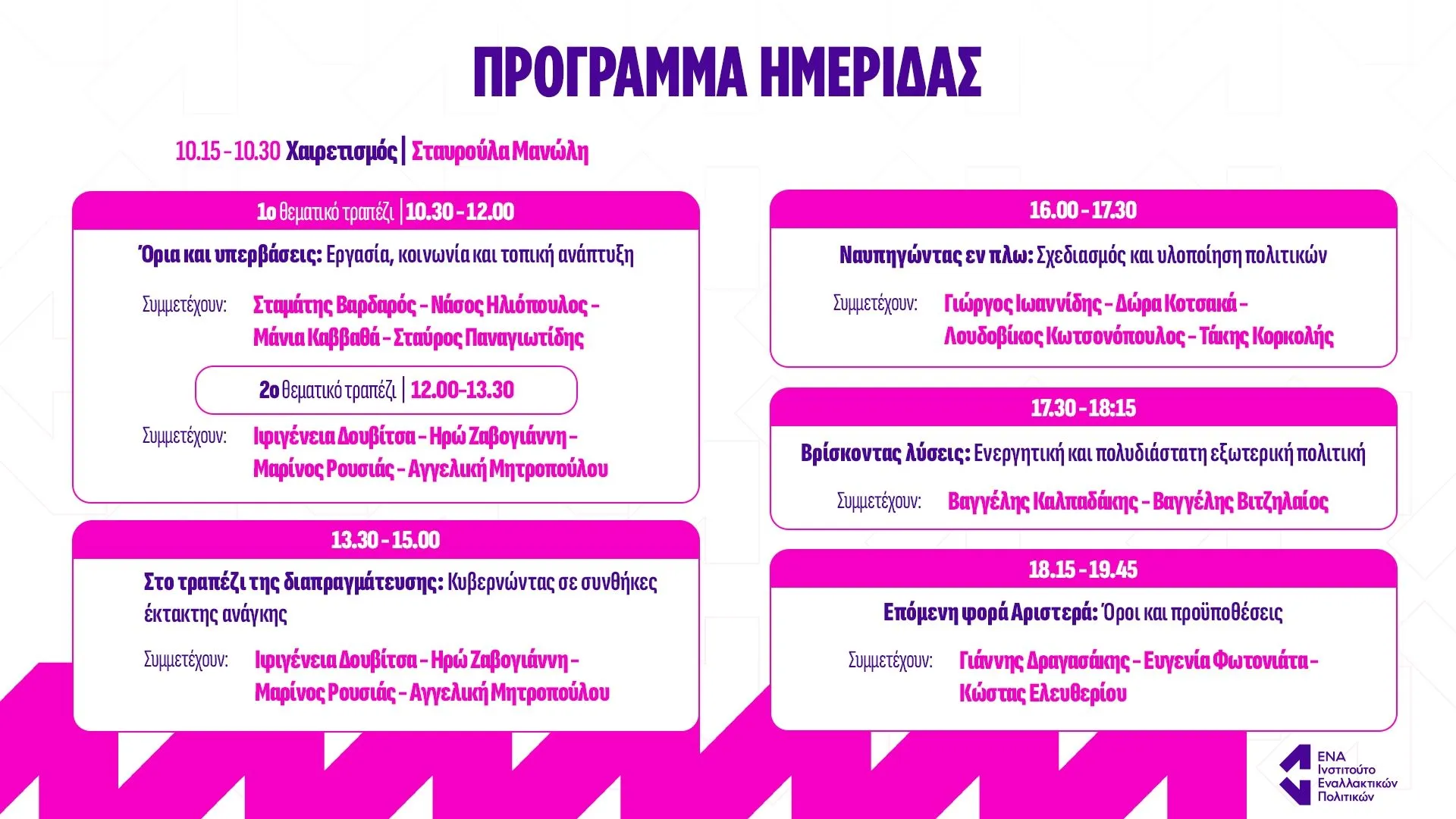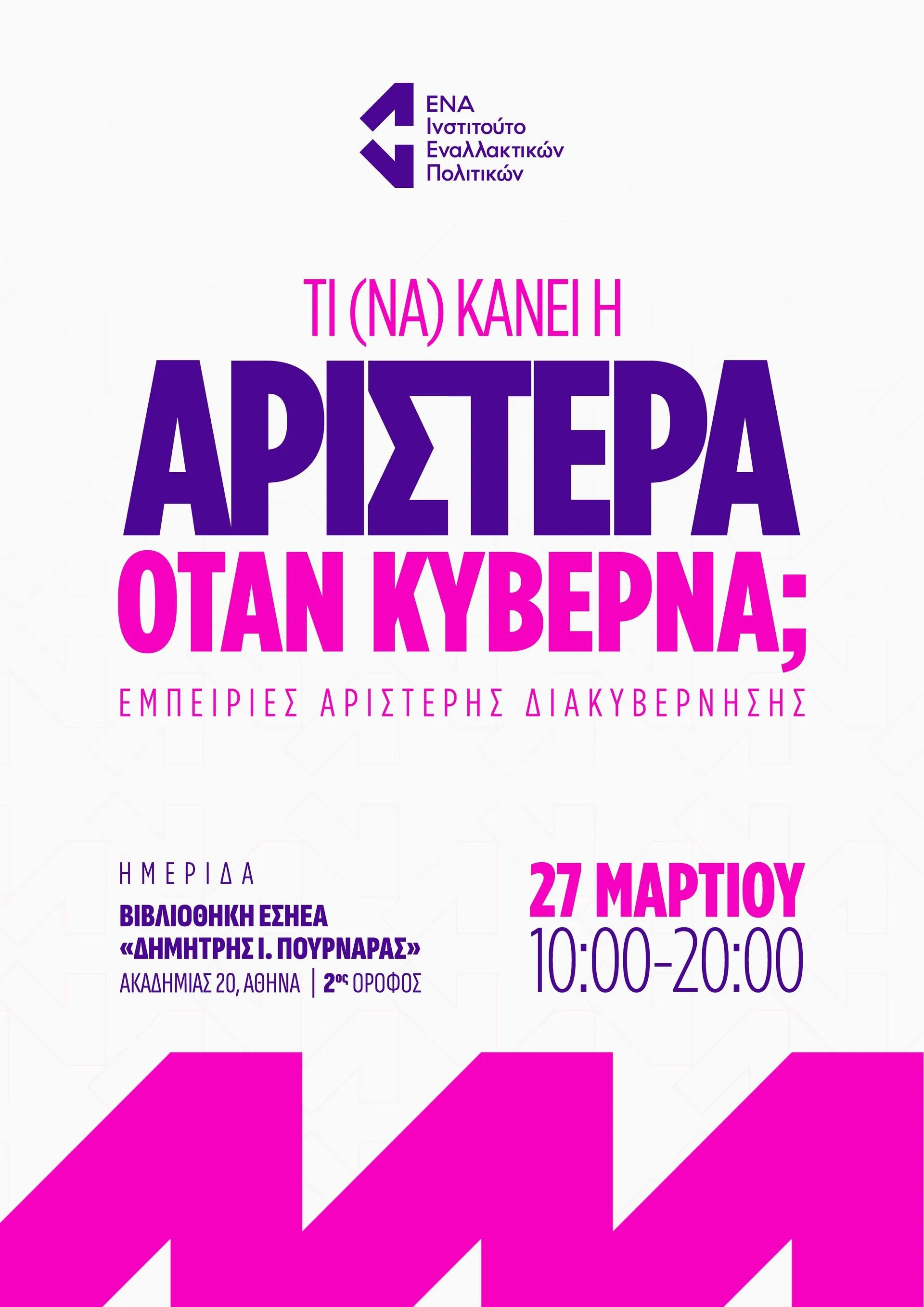 Το ΕΝΑ διοργανώνει ημερίδα με θέμα «Τι (να) κάνει η Αριστερά όταν κυβερνά; Εμπειρίες αριστερής διακυβέρνησης», αύριο Παρασκευή 27 Μαρτίου 2026 (10:00 – 20:00), στη Βιβλιοθήκη της ΕΣΗΕΑ «Δημήτρης Ι. Πουρνάρας» (Ακαδημίας 20, Αθήνα – 2ος όροφος), δίνοντας το λόγο σε όσους και όσες εκπροσωπούν τη νεότερη γενιά στελεχών που υπηρέτησαν το κυβερνητικό εγχείρημα της περιόδου 2015-2019 και καλώντας τους να μοιραστούν μαζί μας τις εμπειρίες και τις σκέψεις τους ως οδηγό για το μέλλον.