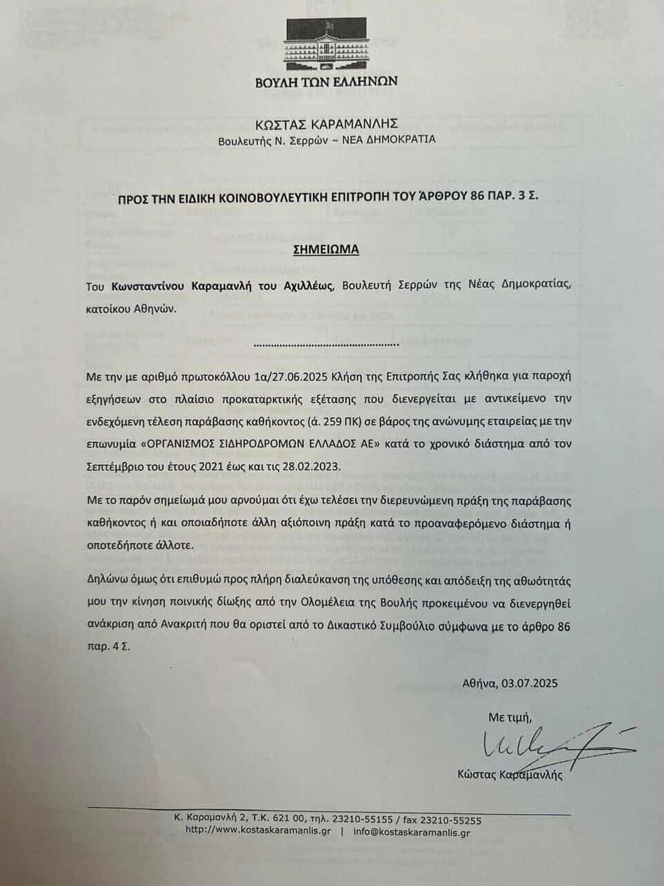 Την παραπομπή του στο Δικαστικό Συμβούλιο ζήτησε, όπως αναμένετο, με υπόμνημα του προς την προανακριτική για τα Τέμπη ο πρώην υπουργός, Κώστας Αχ. Καραμανλής.