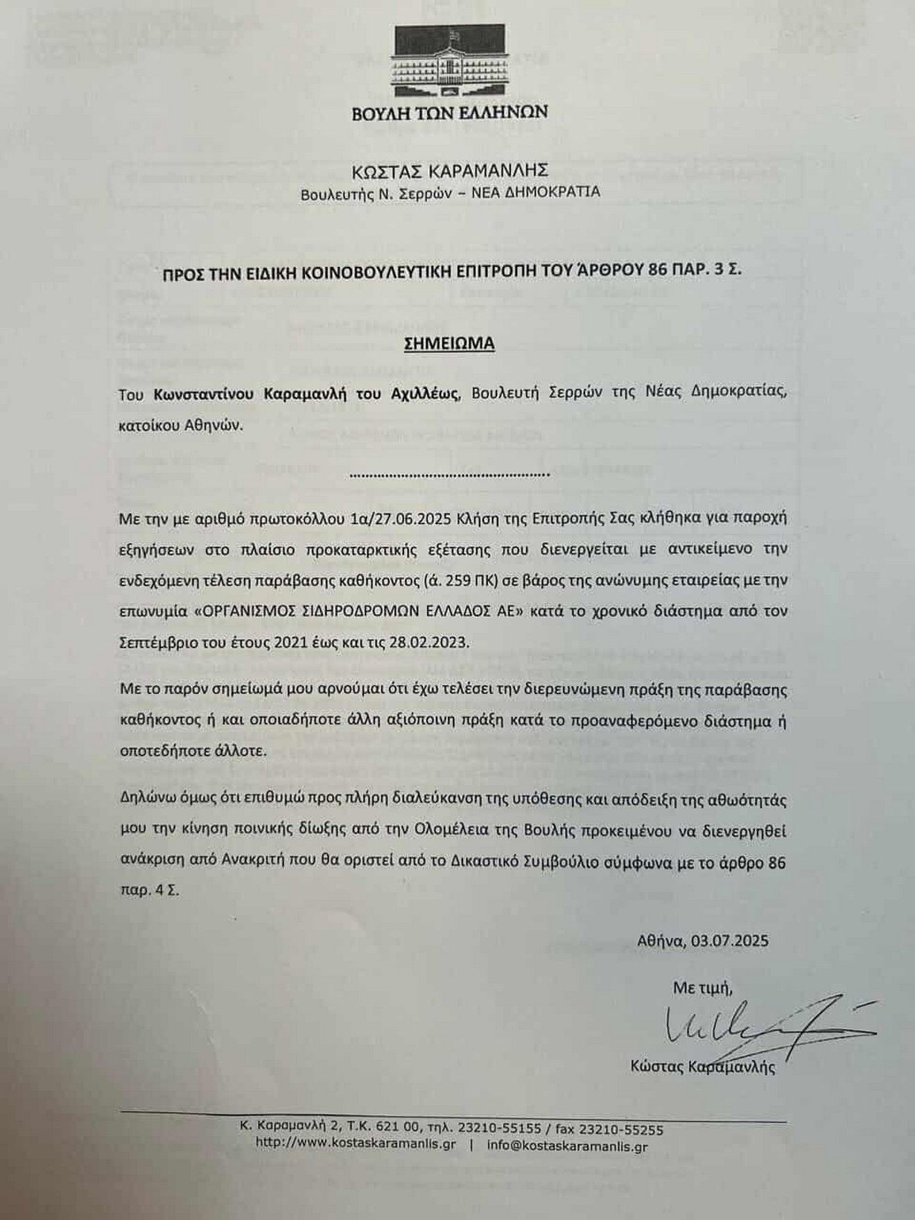 Υπόμνημα Καραμανλή: “Επιθυμώ παραπομπή στο Δικαστικό Συμβούλιο”