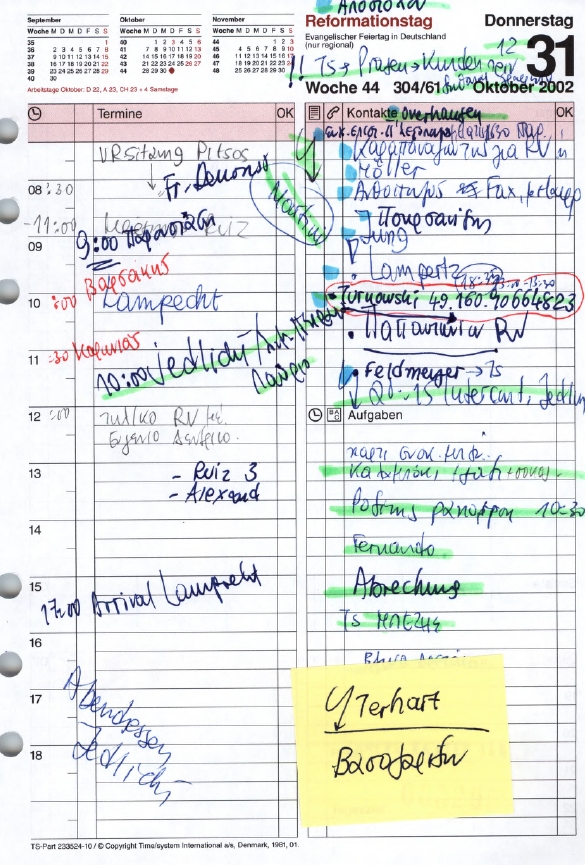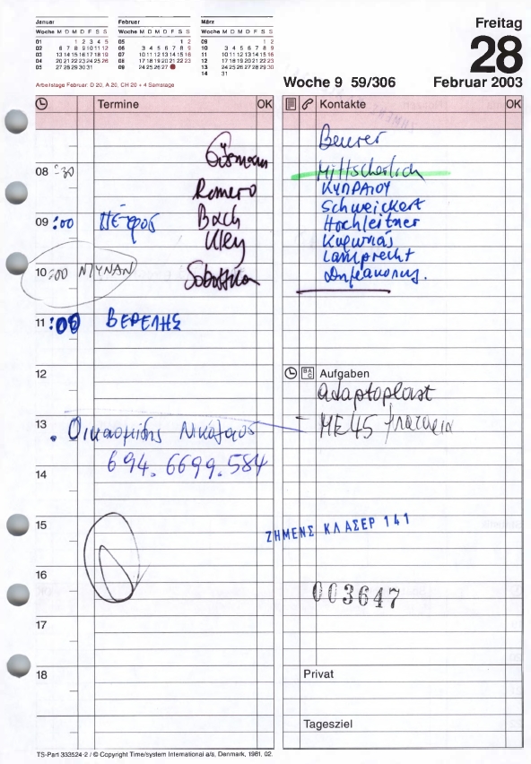 Με τους δύο εμπλεκόμενους να αρνούνται κατηγορηματικά ότι υπάρχει η παραμικρή δόση αλήθειας σε όλα αυτά, η ελληνική Δικαιοσύνη στράφηκε και προς τα ογκώδη ημερολόγια της Αικατερίνης Τσακάλου, προκειμένου να καταλήξει σε κάποιο συμπέρασμα. Σε αυτά καταγράφονται στα ελληνικά και στα γερμανικά, δεκάδες πολιτικά και μη πρόσωπα, ραντεβού που κλείστηκαν ή έπρεπε να γίνουν, ενέργειες και εντολές του Μιχ. Χριστοφοράκου που έπρεπε να ολοκληρωθούν.