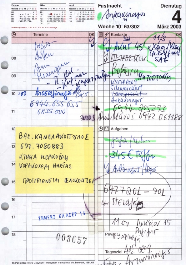 Στο ημερολόγιο της κ.Τσακάλου στις 4 Μαρτίου 2003 αναφέρεται το όνομα Βασ.Κανελακόπουλος και το Κορακοχώρι Ηλείας με τη σημείωση “προσγειώνεται ελικόπτερο”. Η γραμματέας του κ.Χριστοφοράκου είχε ερωτηθεί σχετικά στη συμπληρωματική κατάθεση της, καθώς στο Κορακοχώρι βρίσκεται το εξοχικό του Κώστα Σημίτη. Η κ.Τσακάλου είχε απαντήσει ότι το όνομα δεν της θύμιζε κάτι, προσθέτοντας όμως μετά ότι ενδεχομένως να πρόκειται για χειριστή ελικοπτέρου.