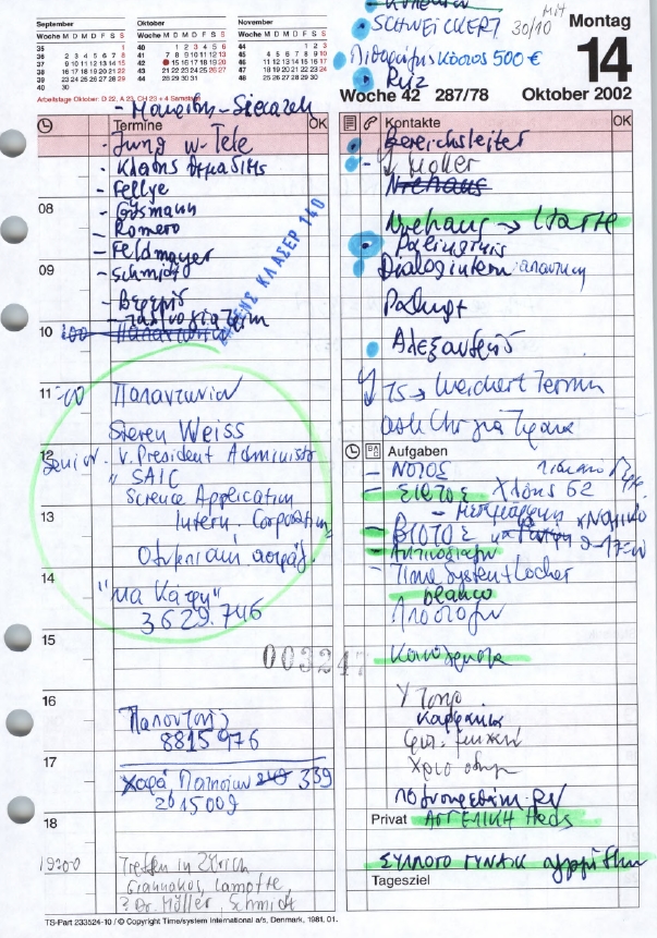 Στις 14 Οκτωβρίου στο ημερολόγιο της Τσακάλου αναφέρεται συνάντηση Χριστοφοράκου- Παπαντωνίου στο υπουργείο Άμυνας παρουσία του Στήβεν Βάις, τεχνικού συμβούλου της SAIC. Ακολουθούν δύο ραντεβού του κ.Χριστοφοράκου με το γγ του υπουργείου Άμυνας Σπύρο Τραυλό και στο τέλος του μήνα νέα επικοινωνία με τον κ.Παπαντωνίου.
