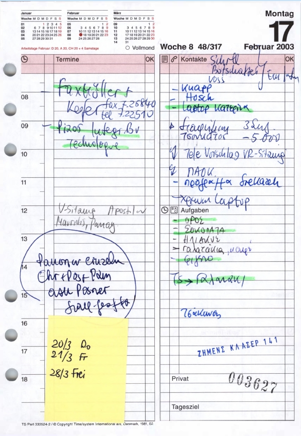 Tα ημερολόγια της περιόδου 2000-2003 επανέρχονται στο προσκήνιο, με τη διαβίβαση της δικογραφία για την ανάθεση του συστήματος ασφαλείας των Ολυμπιακών Αγώνων, C4I, στη Βουλή. Η κατάθεση του πρώην διευθυντή Εξοπλισμών του υπουργείου Εθνικής Άμυνας, Ευαγγ. Βασιλάκου, ο οποίος πρωτόδικα έχει καταδικαστεί σε ποινή κάθειρξης 16 ετών για τη σύμβαση του ηλεκτρονικού συστήματος Sonak στο Στρατό Ξηράς, “έδεσε” τα χέρια του εφέτη ειδικού ανακριτή, Δημ. Ορφανίδη, ο οποίος σύμφωνα με το νόμο περί ευθύνης υπουργών, υποχρεώθηκε να διαβιβάσει άμεσα τη δικογραφία στη Βουλή.