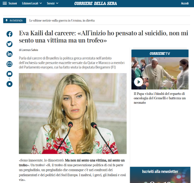 Όπως αποκαλύπτει σε σημερινό της δημοσίευμα η ιταλική Corriere Della Sera, η Εύα Καϊλή δέχθηκε την πρώτη επίσκεψη από βουλευτή του ΕΚ και συγκεκριμένα από τη Ντέμπορα Μπεργκαμίνι, Ιταλίδα βουλευτή της Forza Italia και μέλος της Κοινοβουλευτικής Συνέλευσης του Συμβουλίου της Ευρώπης και η ίδια μετέφερε όσα δήλωσε η Ελληνίδα ευρωβουλεύτρια.