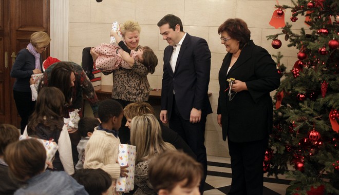 Ο Έλληνας πρωθυπουργός καλωσόρισε λίγο μετά τις 10.00 το πρωί αγόρια και κορίτσια προσχολικής ηλικίας από 2 1/2 έως 5 1/2 ετών που φιλοξενούνται στο Πρότυπο Εθνικό Νηπιοτροφείο στην Καλλιθέα. Ο Αλέξης Τσίπρας αφού τα υποδέχτηκε μοίρασε στα μικρά παιδιά δώρα.