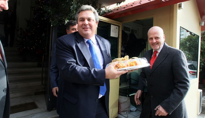 Λίγο νωρίτερα, οι κάμερες κατέγραψαν την είσοδο του κ. Καμμένου στα γραφεία του επίτιμου προέδρου της ΝΔ, κρατώντας ξεροτήγανα.