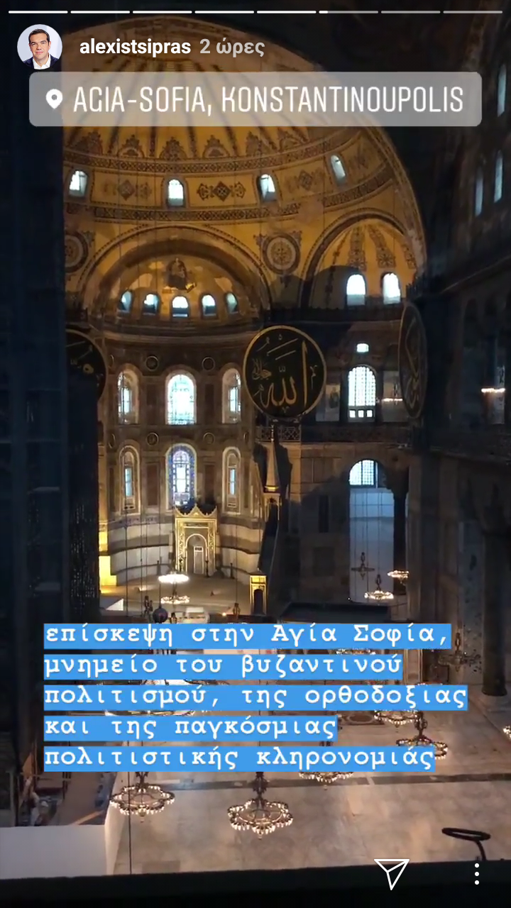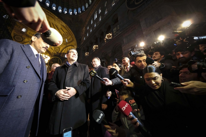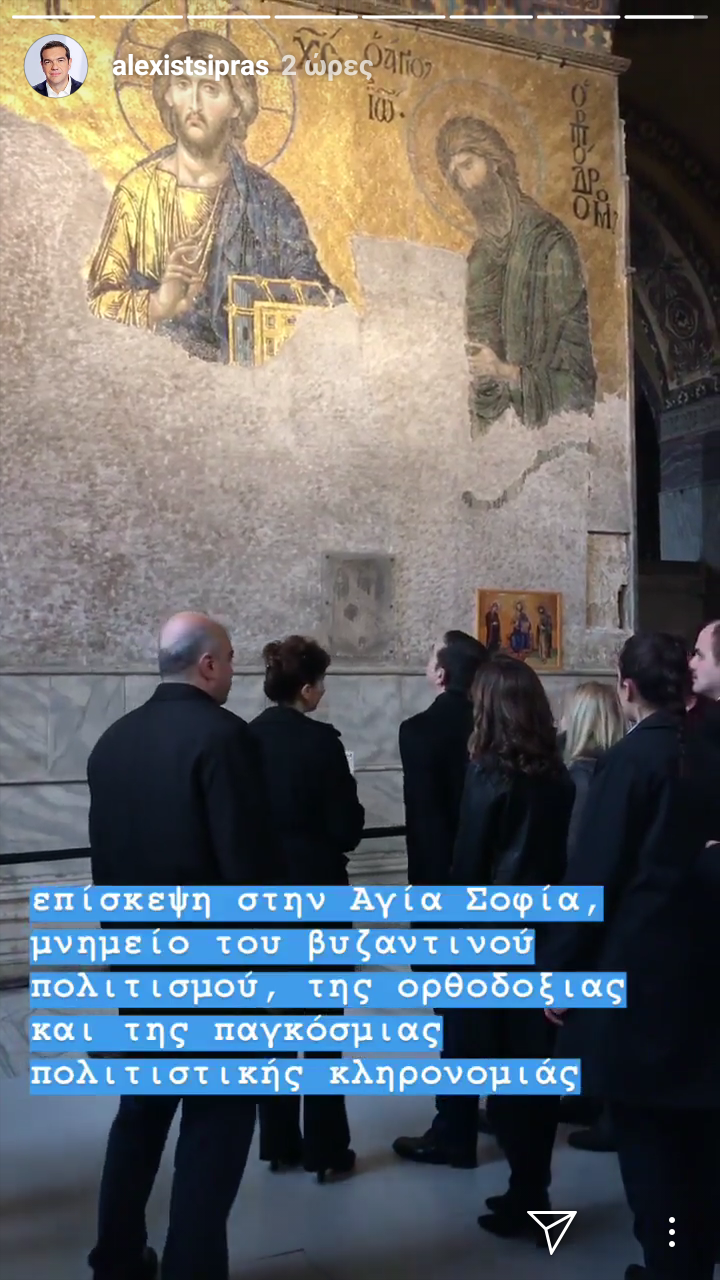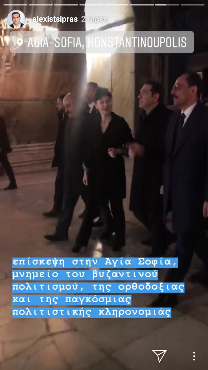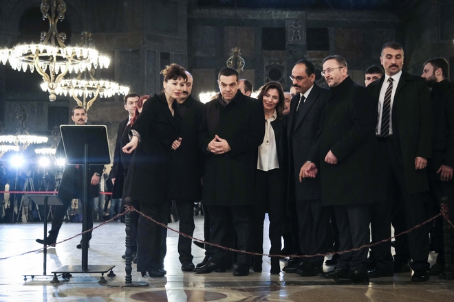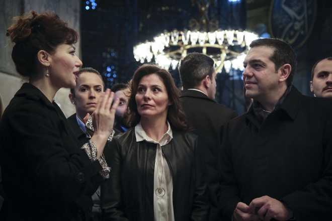 Ο Αλέξης Τσίπρας επισκέφθηκε την Αγία Σοφία συνοδευόμενος από τον υπουργό Παιδείας Κώστα Γαβρόγλου, τον αν. υπουργό Εξωτερικών Γιώργο Κατρούγκαλο, τον υφ. Εξωτερικών Μ. Μπόλαρη και τη σύντροφό του Μπέτυ Μπαζιάνα.