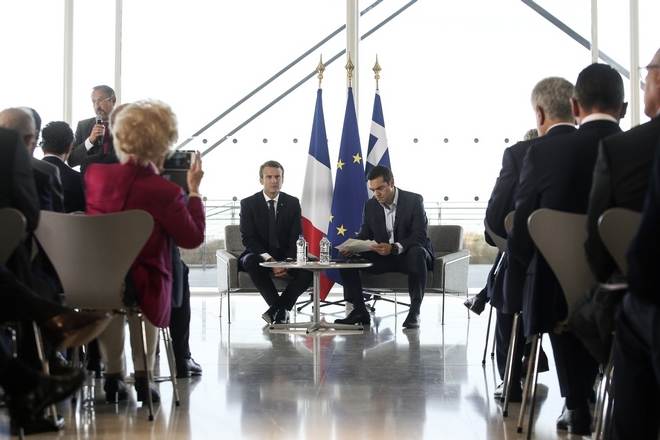 Greek PM Alexis Tsipras and French President Emmanuel Macron meets members of the Greek and French business community at Niarchos Foundation,in Athens, on Sept. 8, 2017 / , , , , 8 , 2017