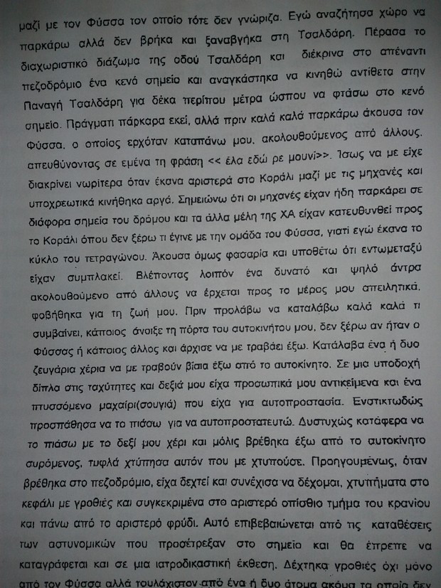 Πριν προλάβω να καταλάβω καλά καλά τι συμβαίνει, κάποιος άνοιξε την πόρτα του αυτοκινήτου μου και άρχισε να με τραβάει προς τα έξω, δεν ξέρω εάν ήταν ο Φύσσας ή κάποιος άλλος. Σε μία υποδοχή, δίπλα στις ταχύτητες και δεξιά μου είχα προσωπικά αντικείμενα και ένα πτυσσόμενο μαχαίρι – σουγιά – για αυτοπροστασία. Ενστικτωδώς, προσπάθησα να το πιάσω για να αυτοπροστατευθώ. Δυστυχώς, κατάφερα να το πιάσω με το δεξί μου χέρι και μόλις βρέθηκα έξω από το αυτοκίνητο συρόμενος, τυφλά χτύπησα αυτόν που με χτυπούσε. Προηγουμένως, όταν βρέθηκα στο πεζοδρόμιο, είχα δεχτεί και συνέχισα να δέχομαι χτυπήματα στο κεφάλι με γροθιές και συγκεκριμένα, στο αριστερό οπίσθιο τμήμα του κρανίου μου και πάνω από το αριστερό φρύδι. Αυτό επιβεβαιώνεται και από τις καταθέσεις αστυνομικών που προσέτρεξαν στο σημείο και θα έπρεπε να καταγράφεται και σε μία ιατροδικαστική έκθεση. Δέχτηκα γροθιές όχι μόνο από τον Παύλο Φύσσα, αλλά τουλάχιστον από ακόμα δύο άτομα τα οποία δεν γνωρίζω. Όπως προείπα, δεν γνώριζα τον Φύσσα προσωπικά και δεν είχα προσωπικές διαφορές μαζί του. Ήταν ο φόβος, η ταραχή, η κακιά στιγμή”.