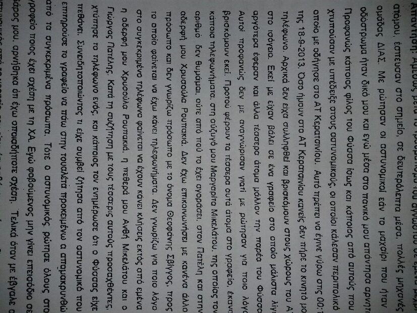Αμέσως μετά το τραυματισμό του άγνωστου σε εμένα μέχρι τότε ατόμου, έσπευσαν στο σημείο, σε δευτερόλεπτα μετά, πολλές μηχανές της ομάδας ΔΙΑΣ. Με ρώτησαν οι αστυνομικοί εάν το μαχαίρι που ήταν στο οδόστρωμα ήταν δικού μου και εγώ μέσα στο πανικό μου απάντησα αρνητικά. Προφανώς κάποιους φίλους του Φύσσα ίσως και κάποιος από αυτούς που με χτύπησαν, με υπέδειξε στους αστυνομικούς, οι οποίοι κάλεσαν περιπολικό το οποίο με οδήγησε στο ΑΤ Κερατσινίου. Αυτό πρέπει να έγινε γύρω στις 00:10 της 18-9-2013. Όσο ήμουν στο ΑΤ Κερατσινίου κανείς δεν πήρε το κινητό μου τηλέφωνο. Αρχικά δεν είχα συλληφθεί και βρισκόμουν στους χώρους του ΑΤ στο ισόγειο. Εκεί με είχαν βάλει σε ένα γραφείο, στο οποίο μάλιστα λίγο αργότερα έφεραν και άλλα τέσσερα άτομα, μάλλον την παρέα του Φύσσα. Αυτοί προφανώς δεν με αναγνώρισαν γιατί με ρώτησαν για ποιο λόγο βρισκόμουν εκεί. Προτού φέρουν τα τέσσερα αυτά άτομα στο γραφείο, έκαναν κάποια τηλεφωνήματα, στη σύζυγο μου Μ.Μ., της οποίας τον αριθμό δεν θυμάμαι, ούτε από πού το έχει αγοράσει, στον Πατέλη και στην αδερφή μου Χ.Ρ. Δεν έχω επικοινωνήσει με κανένα άλλο πρόσωπο και δεν γνωρίζω πρόσωπο με το όνομα Θ.Σ., προς τον οποίο φαίνεται να έχω κάνει τηλεφωνήματα. Δεν γνωρίζω για ποιο λόγο στο συγκεκριμένο τηλέφωνο φαίνεται να έχουν κάνει κλήσεις εκτός από εμένα η αδερφή μου Χ.Ρ., η πεθερά μου Α.Μ. και ο Γιώργος Πατέλης. Κατά τη συζήτηση με τους τέσσερις αυτούς προσαχθέντες, χτύπησε το τηλέφωνο ενός και κάποιος τον ενημέρωσε ότι ο Φύσσας είχε πεθάνει. Συνειδητοποιώντας τι είχε συμβεί ζήτησα από τον αστυνομικό που επιτηρούσε το γραφείο να πάω στην τουαλέτα, προκειμένου να απομακρυνθώ από τα συγκεκριμένα πρόσωπα. Τότε ο αστυνομικός ρώτησε όλους στο γραφείο ποιος έχει σχέση με τη Χ.Α. Εγώ φοβούμενος μην γίνει επεισόδιο σε βάρος μου, αρνήθηκα ότι έχω οποιαδήποτε σχέση. Τελικά όταν με έβγαλε ο αστυνομικός από το γραφείο, του είπα ότι φοβάμαι να είμαι μαζί με αυτούς και ζήτησα να με βάλει κάπου αλλού. Αυτός είπε ότι κατάλαβε και να πάρω το ασανσέρ και να ανέβω στο τρίτο όροφο όπου βρισκόταν το τμήμα ασφαλείας. Πράγματι ανέβηκα στον τρίτο όροφο, ασυνόδευτος και οι εκεί αστυνομικοί με ρώτησαν τι ακριβώς θέλω. Με έβαλαν σε ένα δωμάτιο υπό επιτήρηση. Εγώ διατηρούσα ακόμα το κινητό μου τηλέφωνο και έκαναν ακόμα δύο τηλεφωνήματα στην αδερφή μου για να την κατατοπίσω που να έρθει να με βρει. Πήρα την αδερφή μου γιατί ήταν η πιο ψύχραιμη εκείνη τη στιγμή και μπορούσε να με βοηθήσει πιο αποτελεσματικά. Η αδερφή μου ενημέρωσε ότι υπήρχαν γύρω από το κτίριο της αστυνομίας περίπου 300 άτομα, προφανώς αναρχικοί, σε διάφορα σημεία, ότι δεν μπορούσε να περάσει και τελικά μου έστειλε τσιγάρα με έναν αστυνομικό. Μετά ήρθαν στο τμήμα και άλλοι αστυνομικοί της ασφάλειας και από την κρατική ασφάλεια, όχι μόνο από το ανθρωποκτονιών, και μου ανακοίνωσαν ότι συλλαμβάνομαι, αφότου ομολόγησα τη τέλεση ανθρωποκτονίας. Μετά μεταφέρθηκα γύρω στις τέσσερις το πρωί, από το ΑΤ Κερατσινίου στα κεντρικά της ασφάλειας στη λεωφόρο Αλεξάνδρας.