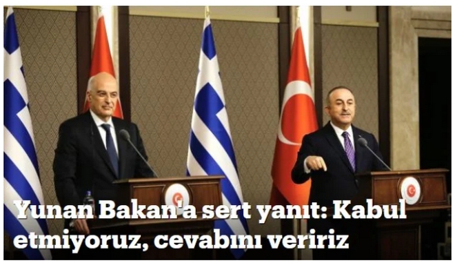 Την ίδια ώρα τα τουρκικά ΜΜΕ παρουσιάζουν με τη δική τους «οπτική» το σκληρό διπλωματικό πινγκ πονγκ δηλώσεων μεταξύ των ΥΠΕΞ Ελλάδας και Τουρκίας. Στο σύνολό τους εκθειάζουν τη στάση του Μ. Τσαβούσογλου, που – σύμφωνα με την πλειοψηφία των σχολίων των τουρκικών media- «αποστόμωσε» τον Ν. Δένδια. Στον Έλληνα ΥΠΕΞ από την άλλη καταλογίζουν διάθεση για “καυγά”…