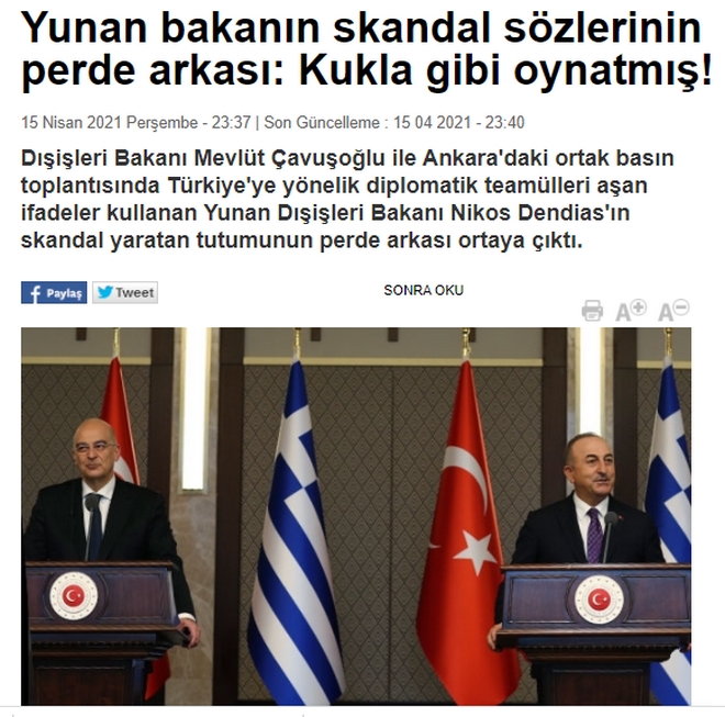 Στο ίδιο μήκος κύματος και η Vatan, που έκανε λόγο για «σκανδαλώδεις φράσεις» του Έλληνα υπουργού Νίκου Δένδια. Στο άρθρο της που τιτλοφορείται «Το παρασκήνιο των σκανδαλωδών λέξεων του Έλληνα ΥΠΕΞ: Το χειρίστηκε σαν μαριονέτα» η τουρκική εφημερίδα σχολιάζει μεταξύ άλλων: «Παρόλο που ο Τούρκος υπουργός Εξωτερικών Μεβλούτ Τσαβούσογλου παρουσίασε διπλωματικές πρακτικές, ο κ. Δένδιας επέδειξε σκανδαλώδη συμπεριφορά». Επικαλούμενη ελληνικά ΜΜΕ, η Vatan εξαγάγει το συμπέρασμα ότι ο κ. Δένδιας είχε οδηγίες από τον πρωθυπουργό Κ. Μητσοτάκη να είναι ετοιμοπόλεμος στην περίπτωση που κατά τη συνέντευξη Τύπου δεχτεί κάποια επίθεση από τον Τούρκο ομόλογό του. Αυτό ωστόσο, κατά την τουρκική εφημερίδα, δεν συνέβη καθώς «ο κ. Τσαβούσογλου σε φιλικό κλίμα εξέφρασε τις διαφορές απόψεων μεταξύ των δύο χωρών βασιζόμενος σε διπλωματικές πρακτικές. Το επιθετικό ωστόσο ύφος του Νίκου Δένδια άλλαξε μέσα σε μια στιγμή το κλίμα της συνάντησης.
