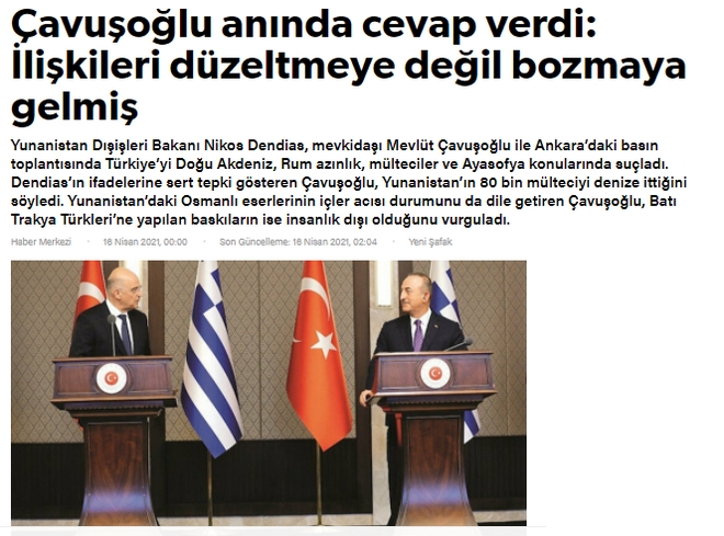 Από την πλευρά της, η φιλοκυβερνητική Yeni Safak τιτλοφορεί το άρθρο της: «Ο Τσαβούσογλου απάντησε αμέσως: (Ο Δένδιας) ήρθε για να καταστρέψει τις διμερείς σχέσεις, όχι να τις διορθώσει». Όπως αναφέρει στο κείμενό της «ο Έλληνας υπουργός Εξωτερικών Νίκος Δένδιας κατηγόρησε την Τουρκία για τη διαχείριση της ελληνικής μειονότητας, για το προσφυγικό και την Αγιά Σοφιά. Ο Τσαβούσογλου αντέδρασε έντονα στις δηλώσεις αυτές, και τόνισε ότι η Ελλάδα έσπρωξε 80.000 πρόσφυγες στη θάλασσα. (..) Υπογράμμισε μάλιστα ότι η καταπίεση που υφίστανται οι μουσουλμάνοι της Δυτικής Θράκης είναι απάνθρωπη.»