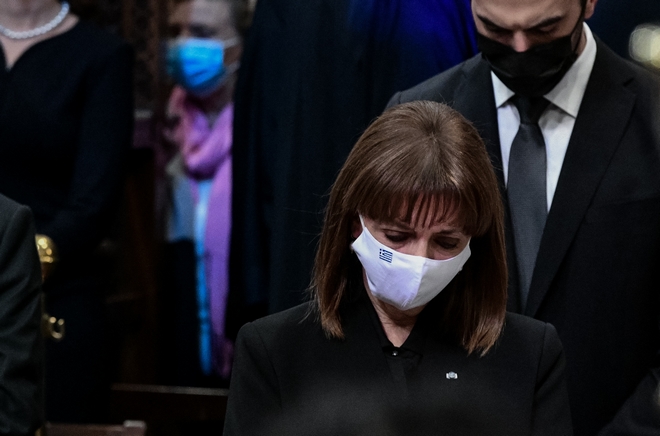 Στην Μητρόπολη βρέθηκε η Πρόεδρος της Δημοκρατίας Κατερίνα Σακελλαροπούλου, με ένα λευκό τριαντάφυλλο, που το άφησε πάνω στο φέρετρο ενώ στη συνέχεια συλλυπήθηκε την οικογένειά της.