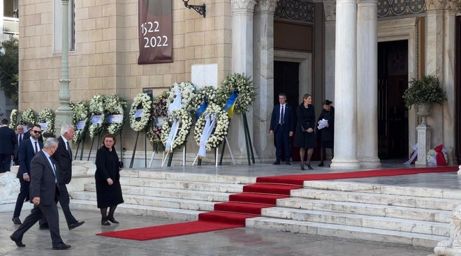 Σημειώνεται πως στη Μητρόπολη έφτασαν και ο αντιπρόεδρος της κυβέρνησης Παναγιώτης Πικραμμένος και η υπουργός Πολιτισμού Λίνα Μενδώνη, οι οποίοι εκπροσωπούν την κυβέρνηση στην κηδεία. Μερίδα των συγκεντρωμένων τούς αποδοκίμασαν κατά την άφιξή τους.