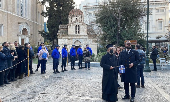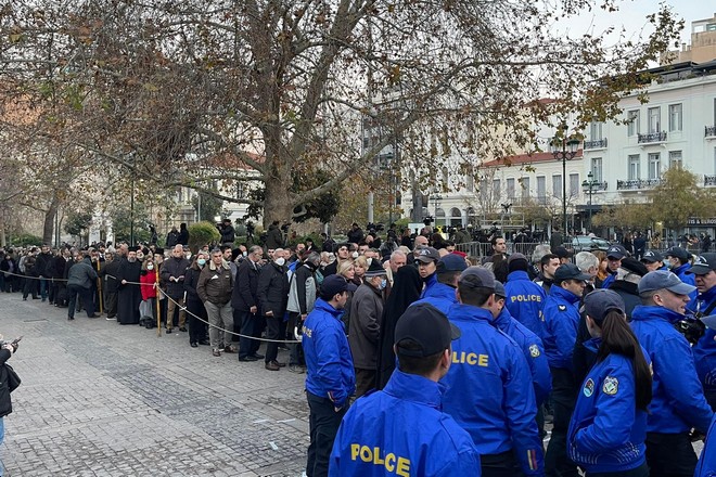 Ουρές σχηματίστηκαν έξω από το παρεκκλήσι, όπου υπήρχε έντονη αστυνομική παρουσία, ενώ ο μέσος όρος της αναμονής των παρευρισκομένων ήταν μία ώρα. Παράλληλα, γεμάτα ήταν και τα γύρω καφέ στα πέριξ της Μητρόπολης με κόσμο που περίμενε.