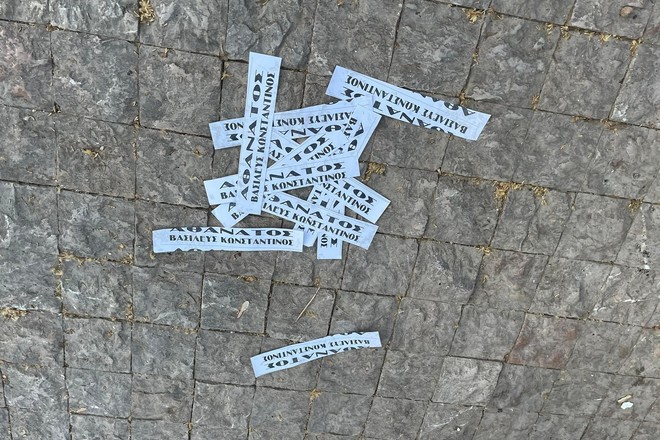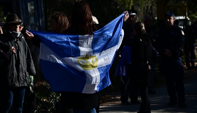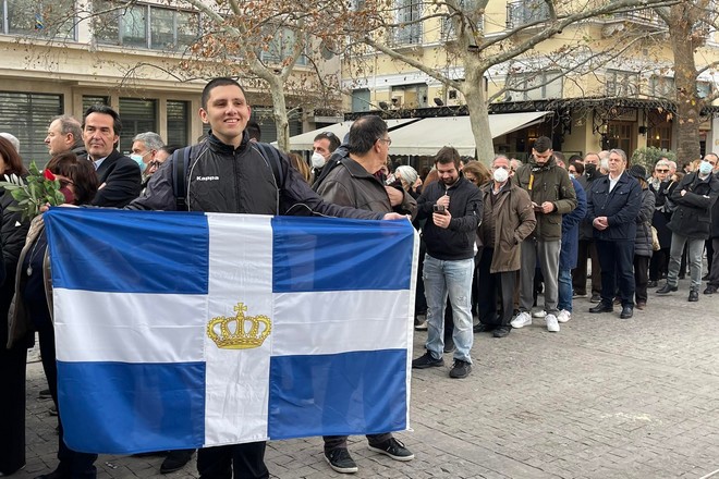 Οι συγκεντρωμένοι έξω από τη Μητρόπολη αποχαιρέτησαν τον Κωνσταντίνο Γλύξμπουργκ τραγουδώντας ανά διαστήματα τον εθνικό ύμνο και φωνάζοντας συνθήματα όπως «Ψωμί-ελιά και Κώτσο βασιλιά», ενώ πολλοί κρατούσαν βασιλικές σημαίες.