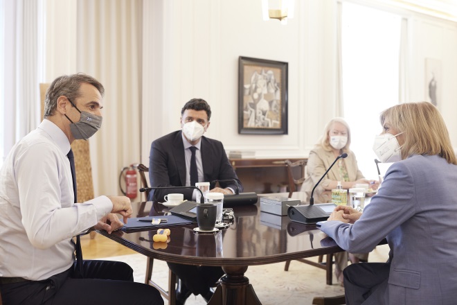 Ο Πρωθυπουργός Κυριάκος Μητσοτάκης συναντήθηκε, στο Μέγαρο Μαξίμου, με την Ευρωπαία Επίτροπο για θέματα Υγείας και Ασφάλειας Τροφίμων, Στέλλα Κυριακίδου.