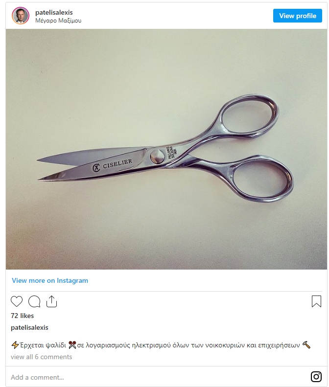 Μία ανάρτηση που έκανε ο σύμβουλος του πρωθυπουργού, Αλέξης Πατέλης, στο instagram, με ένα ψαλίδι και το σχόλιο “έρχεται ψαλίδι στους λογαριασμούς όλων των νοικοκυριών και επιχειρήσεων”, ερμηνεύθηκε ως ένδειξη πως οι ανακοινώσεις για το νέο πακέτο στήριξης κατά της ακρίβειας στο ηλεκτρικό ρεύμα θα γίνουν πολύ σύντομα, ενδεχομένως και αύριο, Πέμπτη 5 Μαϊου, το απόγευμα.
