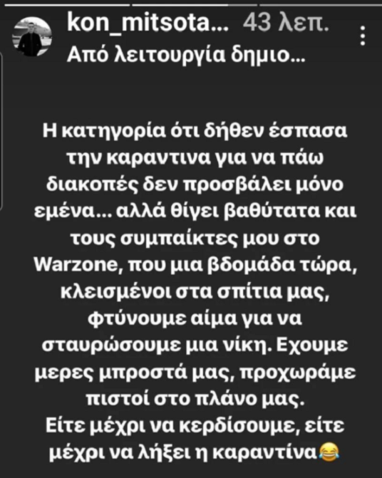 “Η κατηγορία ότι δήθεν έσπασα την καραντίνα για να πάω διακοπές δεν προσβάλει μόνο εμένα… αλλά θίγει και τους συμπαίκτες μου στο Warzone, που μια βδομάδα τώρα, κλεισμένοι στα σπίτια μας, φτύνουμε αίμα για να σταυρώσουμε μια νίκη. Έχουμε μέρες μπροστά μας, προχωράμε πιστοί στο πλάνο μας. Είτε μέχρι να κερδίσουμε, είτε μέχρι να λήξει η καραντίνα”, έγραψε ο ίδιος στα social media.