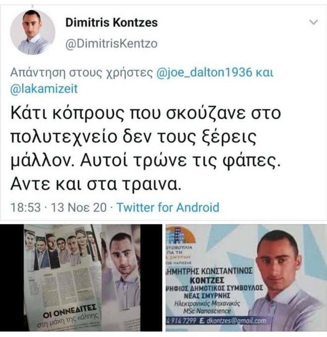 Στην επίμαχή του ανάρτηση στο Twitter, ο Δημήτρης Κοντζές έκανε λόγο για «κόπρους» που «σκούζανε στο Πολυτεχνείο» και οι οποίοι «τρώνε φάπες», ενώ την έκλεισε με τη φράση «άντε και στα τραίνα».