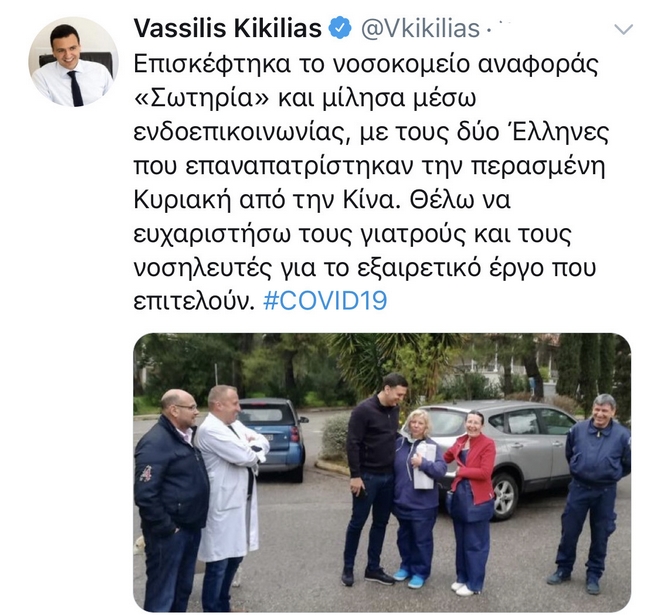 Επισκέφτηκα το νοσοκομείο αναφοράς «Σωτηρία» και μίλησα μέσω ενδοεπικοινωνίας, με τους δύο Έλληνες που επαναπατρίστηκαν την περασμένη Κυριακή από την Κίνα. Θέλω να ευχαριστήσω τους γιατρούς και τους νοσηλευτές, για το εξαιρετικό έργο που επιτελούν. #COVID19