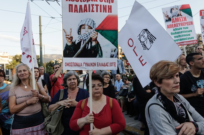 Συγκέντρωση διαμαρτυρίας από το ΠΑΜΕ την ΕΕΔΥΕ και άλλα ταξικά εργατικά σωματεία, έξω από την πρεσβεία του Ισραήλ ενάντια στην επιχείρηση του στρατού του Ισραήλ εναντίων του Παλαιστινιακού λαού, αλλά και μεταφορά της Αμερικανικής Πρεσβείας στην Ιερουσαλήμ. Δευτέρα 14/5/2018. Eurokinissi