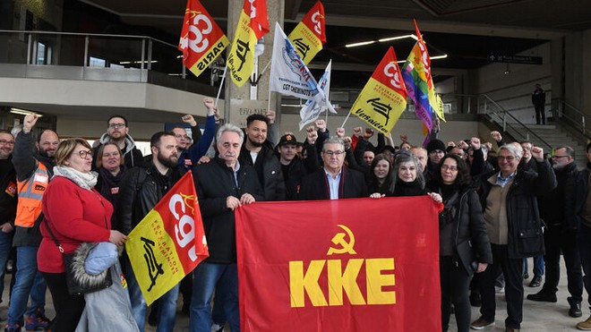 Στο πλευρό των απεργών στη Γαλλία βρίσκεται ο γγ της ΚΕ του ΚΚΕ, ο οποίος επισκέφθηκε τον σιδηροδρομικό σταθμό του Μον Παρνάς και έγινε δεκτός με συνθήμαα και τραγούδια από τους εργαζόμενους σιδηροδρομικούς.