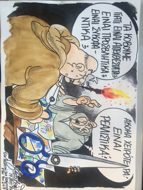 Ο Βαγγέλης Χερουβείμ πρόσθεσε πως και οι Έλληνες γελοιογράφοι συμφωνούν ότι ή θα περιληφθούν όλα τα έργα ή κανένα. Ετοιμάζουν μάλιστα απάντηση με την πένα του ο καθένας. Το πρώτο δείγμα είναι το δώρο του σκιτσογράφου της Αυγής στην εκπομπή “Πεζοί στον Αέρα”: