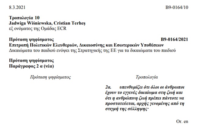 Συγκεκριμένα επρόκειτο για την τροπολογία 10 που κατέθεσαν στις 8 Μαρτίου οι ευρωβουλευτές Jadwiga Wiśniewska και Cristian Terheş της ομάδας ECR (Ευρωπαίοι Συντηρητικοί και Μεταρρυθμιστές) με την εξής διατύπωση: “υπενθυμίζει ότι όλοι οι άνθρωποι έχουν το εγγενές δικαίωμα στη ζωή και ότι η ανθρώπινη ζωή πρέπει πάντοτε να προστατεύεται, αρχής γενομένης από τη στιγμή της σύλληψης”.