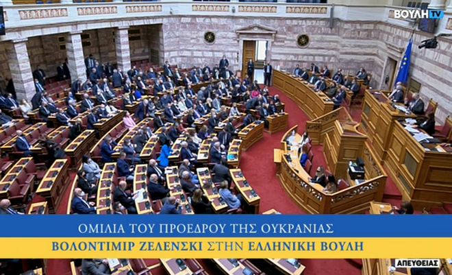 Ολοκληρώθηκε η αναμενόμενη ομιλία του Βολοντίμιρ Ζελένσκι, στο ελληνικό κοινοβούλιο, με τον Ουκρανό πρόεδρο να δέχεται θερμό καλωσόρισμα και συνεχή χειροκροτήματα από τους παρευρισκόμενους.