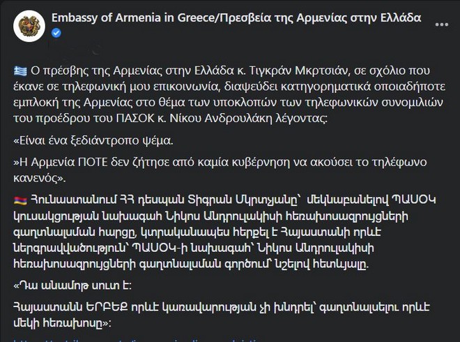 Όπως αναφέρεται χαρακτηριστικά, “ο πρέσβης της Αρμενίας στην Ελλάδα κ. Τιγκράν Μκρτσιάν, σε σχόλιο που έκανε σε τηλεφωνική μου επικοινωνία, διαψεύδει κατηγορηματικά οποιαδήποτε εμπλοκή της Αρμενίας στο θέμα των υποκλοπών των τηλεφωνικών συνομιλιών του προέδρου του ΠΑΣΟΚ κ. Νίκου Ανδρουλάκη λέγοντας: «Είναι ένα ξεδιάντροπο ψέμα. Η Αρμενία ΠΟΤΕ δεν ζήτησε από καμία κυβέρνηση να ακούσει το τηλέφωνο κανενός»”.