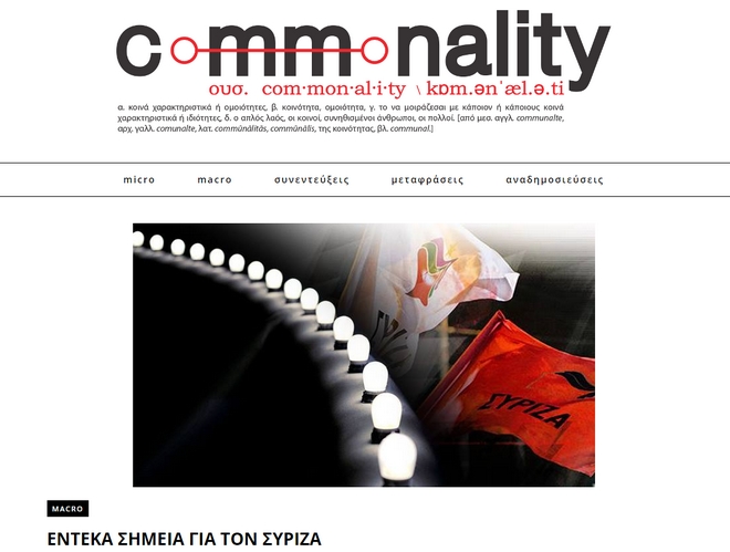 Το όνομα του νέου site είναι “commonality”, δηλαδή “τα κοινά” και έκανε πριν λίγη ώρα “πρεμιέρα” με ένα κείμενο 11 σημείων, σκέψεις πάνω στη λειτουργία του ΣΥΡΙΖΑ, και όχι μόνο, συμβολή της «Πρωτοβουλίας 53+» στον προσυνεδριακό διάλογο του ΣΥΡΙΖΑ.