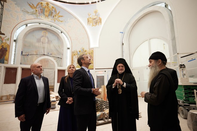 Τον Κυριάκο Μητσοτάκη και τη σύζυγό του υποδέχτηκε ο Αρχιεπίσκοπος Αμερικής κ. Ελπιδοφόρος, ο οποίος τους ξενάγησε στον χώρο, ενώ ο αρχιτέκτονας που έχει σχεδιάσει τον νέο ναό, Σαντιάγο Καλατράβα, εξήγησε το σχέδιο έως την τελική περάτωση του έργου.