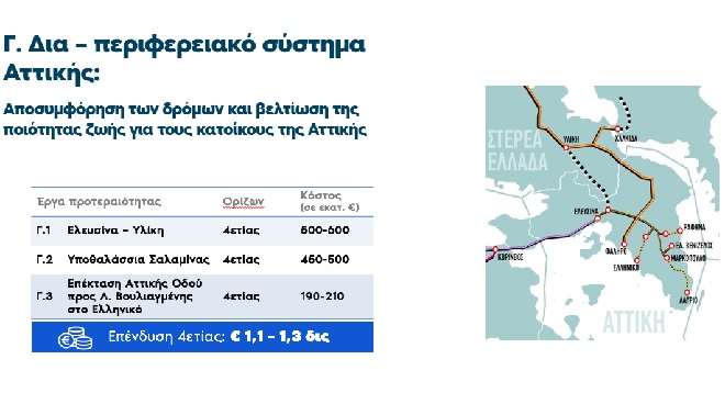 1.Κατασκευή αυτοκινητοδρόμου μήκους 50 χιλιομέτρων που θα συνδέει απευθείας την Υλίκη με την Ελευσίνα. Πρόκειται για ένα έργο πνοής που θα συνδέσει τις δύο εθνικές οδούς (Αθηνών- Θεσσαλονίκης και Αθηνών Πατρών) παρακάμπτοντας επί της ουσίας την Αθήνα και την Αττική. Με τον τρόπο αυτό θα μειωθεί δραστικά ο χρόνος και το κόστος μετακίνησης από το Βορρά προς το Νότο και θα αποφορτισθεί ο Κηφισός