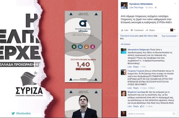 “Από σήμερα πληρώνεις αυξημένο εισητήριο. Πληρώνεις τη ζημιά που κάνει καθημερινά στην Ελληνική οικονομία η κυβέρνηση ΣΥΡΙΖΑ-ΑΝΕΛ.”, ήταν το σχόλιο του Κυριάκου Μητσοτάκη στο facebook του για την αύξηση του εισιτηρίου στα ΜΜΜ αρχής γενομένης από σήμερα.
