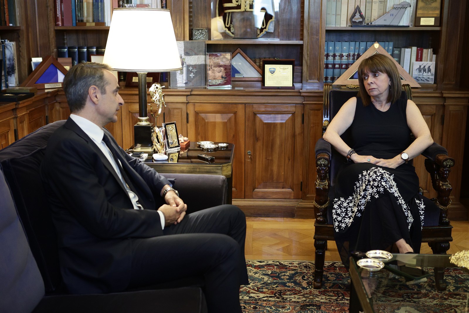 Ο Κυριάκος Μητσοτάκης και η Κατερίνα Σακελλαροπούλου στο Προεδρικό Μέγαρο Eurokinissi / ΒΑΣΙΛΗΣ ΡΕΜΠΑΠΗΣ