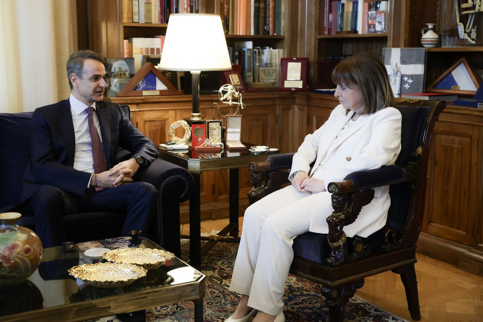 Ο πρωθυπουργός μόλις κάθισε στον καναπέ του Προεδρικού σχολίασε ότι η σημερινή συνάντηση “είναι ξεχωριστή και διαφορετική από τις συνηθισμένες” και ευχαρίστησε την κ.Σακελλαροπούλου σε θεσμικό και προσωπικό επίπεδο για την άψογη συνεργασία.