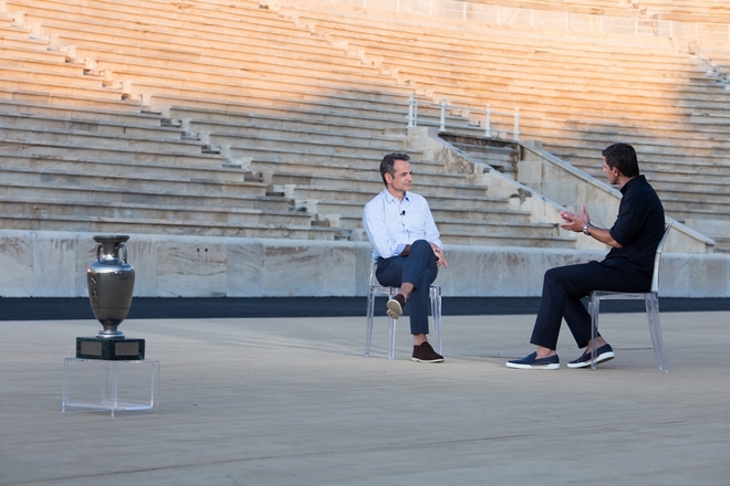 Συζήτηση στην επετειακή εκπομπή «2004 Δευτερόλεπτα» της COSMOTE TV με θέμα την ιστορική κατάκτηση του Euro 2004 από την εθνική ομάδα ποδοσφαίρου είχε ο πρωθυπουργός Κυριάκος Μητσοτάκης με τον Έλληνα διεθνή ποδοσφαιριστή Τάκη Φύσσα στο Καλλιμάρμαρο.
