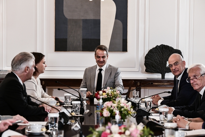 Ο πρωθυπουργός Κυριάκος Μητσοτάκης, συναντήθηκε το πρωί, στο Μέγαρο Μαξίμου με την υπουργό Εξωτερικών της Ομοσπονδιακής Δημοκρατίας της Γερμανίας, Αναλένα Μπέρμποκ.