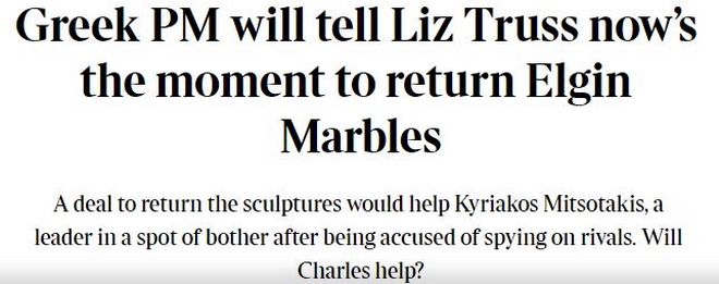 Συμφωνία για την επιστροφή των Γλυπτών του Παρθενώνα στην Ελλάδα θα ζητήσει από την βρετανίδα ομόλογό του Λιζ Τρας, ο Κυριάκος Μητσοτάκης. Όπως είπε ο ίδιος σε συνέντευξή του στους Sunday Times “σε μια εποχή που η κ. Τρας θα επιδιώκει να οικοδομήσει την αξιοπιστία της και ενώ το Ηνωμένο Βασίλειο είναι κάπως στριμωγμένο ως προς τη συνολική του εικόνα μετά την κηδεία της Βασίλισσας, θα είναι μια φανταστική χειρονομία, και αυτό ειναι κάτι που θα της πω”.