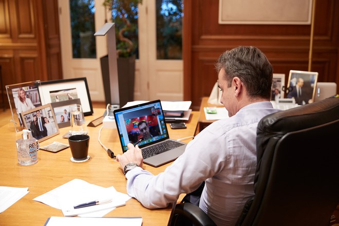 Λόγω των μέτρων για τον κορονοϊό, η επικοινωνία έγινε με βιντεοκλήση σε μια προσπάθεια να ενισχυθεί και το μήνυμα προς τους πολίτες, “Μένουμε σπίτι”.