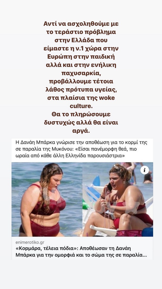 “Αντί να ασχοληθούμε με το τεράστιο πρόβλημα στην Ελλάδα που είμαστε η No1 χώρα στην Ευρώπη στην παιδική αλλά και στην ενήλικη παχυσαρκία, προβάλλουμε τέτοια λάθος πρότυπα υγείας στα πλαίσια της woke culture. Θα το πληρώσουμε δυστυχώς αλλά θα είναι αργά” έγραψε η Αφροδίτη Λατινοπούλου.