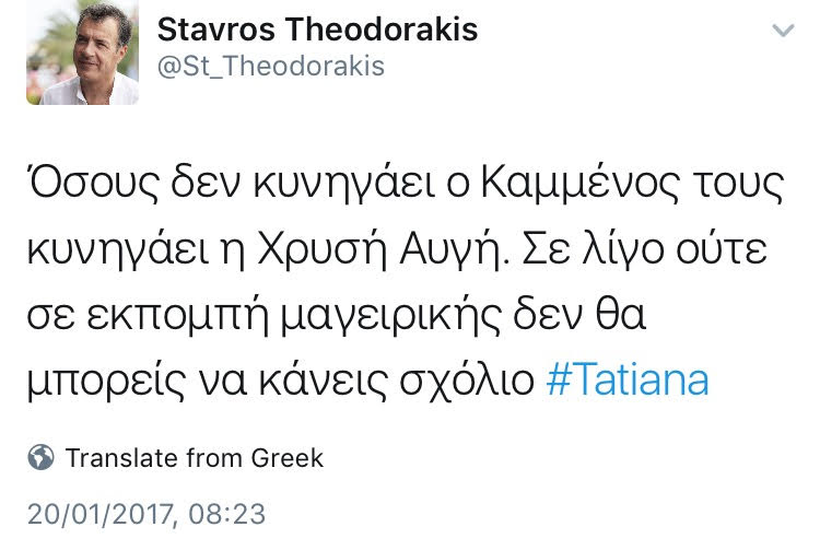 “Όσους δεν κυνηγάει ο Καμμένος τους κυνηγάει η Χρυσή Αυγή. Σε λίγο ούτε σε εκπομπή μαγειρικής δεν θα μπορείς να κάνεις σχόλιο”, σχολίασε στο Twitter ο Σταύρος Θεοδωράκης.